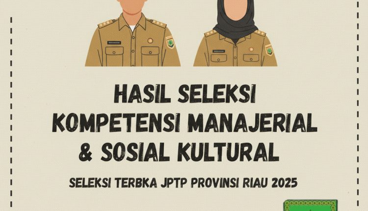 Berdasarkan Keputusan Panitia Seleksi Nomor 15/PANSEL/JPTP/2025 tentang Penetapan Hasil Seleksi Kompetensi Manajerial dan Sosial Kultural Seleksi Terbuka Jabatan Pimpinan Tinggi Pratama Provinsi Riau Tahun 2025, dengan ini diumumkan peserta sebagaimana tercantum pada pengumuman berikut ini: